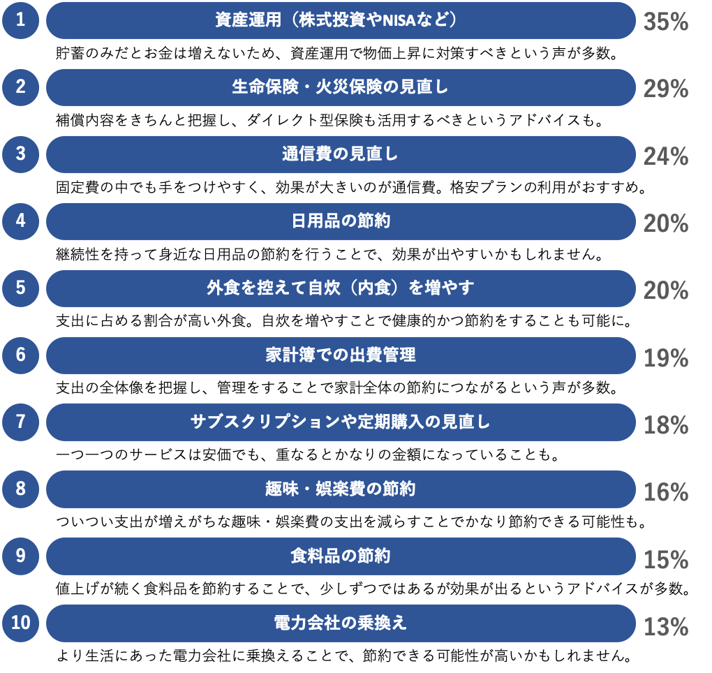 ・お金のプロであるFPが考える値上げを乗り越えるための重要な家計見直しポイントTOP10を紹介。「資産運用(株式投資やNISAなど)」「生命保険・火災保険の見直し」「通信費の見直し」などが上位を占め、固定費の見直しが重要であることがわかる結果に。