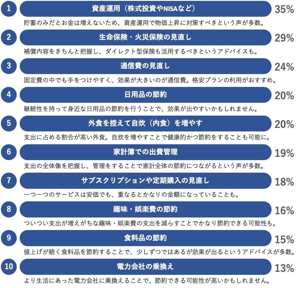 今後も継続すると予想されている値上げへの対策として、お金のプロであるFPに家計の見直しの際に重要なポイントを聞きました。上位には「資産運用(株式投資やNISAなど)」、「生命保険・火災保険の見直し」 、「通信費の見直し」などがランクインし、固定費の見直しを重要視するFPが多いことがわかりました。