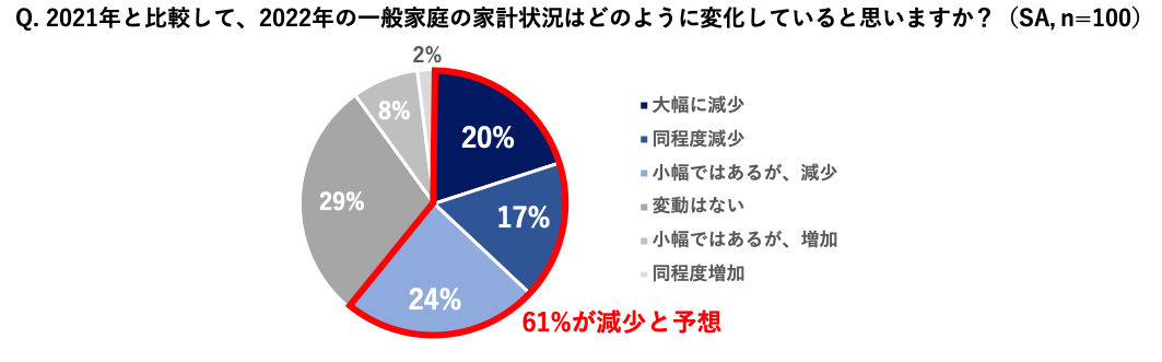 ・半数以上(61%)が2022年の一般家庭の家計状況は2021年より収入が減少していると考えていると回答。