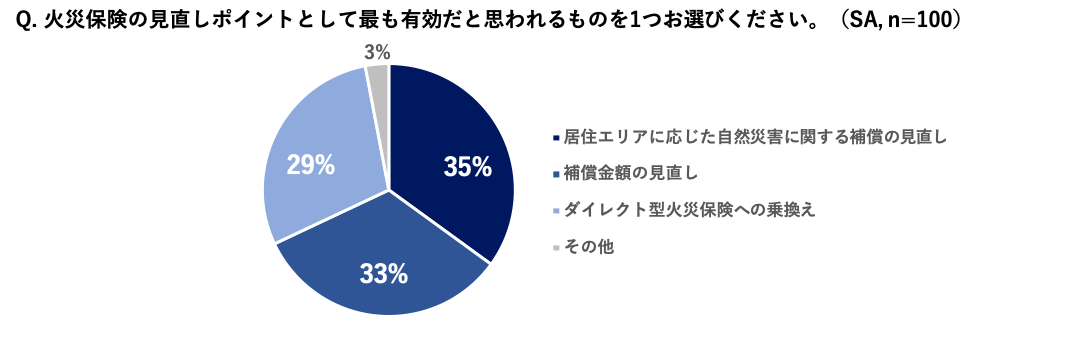 また火災保険の見直しポイントとして、「居住エリアに応じた自然災害に関する補償の見直し(35%)」、「補償金額の見直し(33%)」、「ダイレクト型火災保険への乗換え(29%)」が有効と回答。どれも重要なポイントであることがわかる結果に。その他の回答としては、「契約期間短縮前の長期契約への切替え」などがありました。