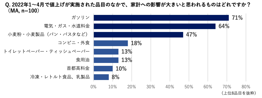 ・2022年1月〜4月に値上げが実施された品目の中で家計への影響が大きいものとして、第1位「ガソリン」、第2位「電気・ガス・水道料金」、第3位「小麦粉・小麦製品(パン・パスタなど)」という結果に。特にガソリンについては、国際情勢の緊迫化による影響が考えられる。