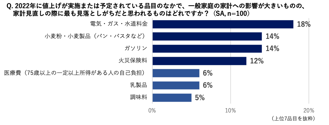 2022年に値上げが予定されている品目のなかで、家計への影響が大きいものの、家計見直しの際に最も見落としがちなものとして、第1位「電気・ガス・水道料金」、第2位が「小麦粉・小麦製品(パン・パスタなど)」 「ガソリン」 、その次が「火災保険」という結果になりました。