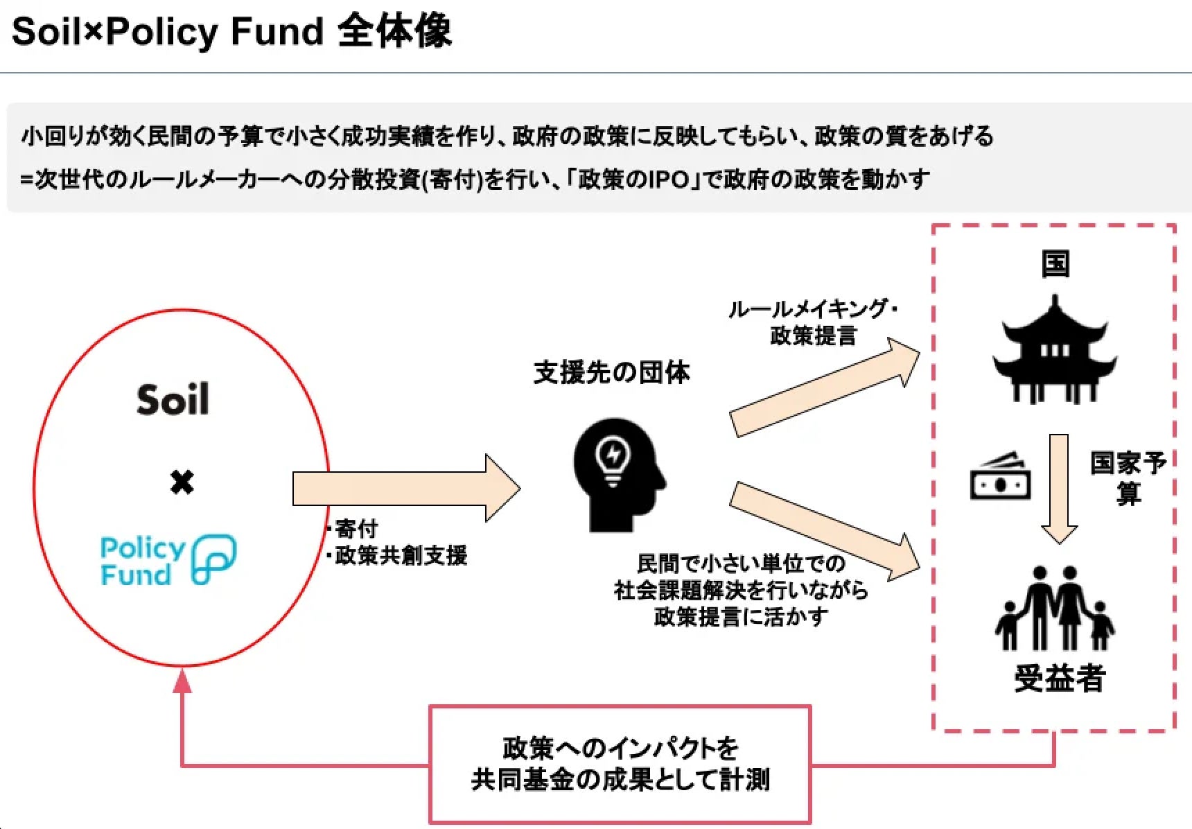 一般社団法人ソウレッジ(静岡県掛川市、代表理事:鶴田七瀬)は、この度、政策を軸にした社会課題解決を加速するための寄付基金「Policy Fund」等を運営する株式会社PoliPoli(東京都千代田区、代表取締役:伊藤和真、以下PoliPoli)と一般財団法人Soil(東京都渋谷区、代表理事:久田哲史)の共同企画「SoilxPolicy Fund」の支援先になりましたことをお知らせします。