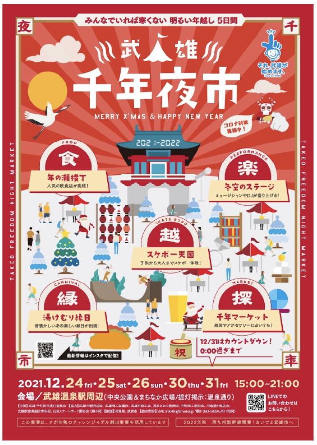 2020秋に武雄市の賑わい実証実験として開催した「武雄温泉 千年夜市」が大盛況となり、2021年の年末「さが自発チャレンジモデル創出事業を活用し「武雄千年夜市」開催しました。