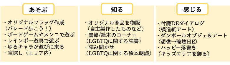 九州レインボープライドでは、毎年、子ども達が自身の力でブースを出店し、皆と交流を図ることを目標としたキッズエリアを設けています。今年は「遊び」ながら「学んで」ほしいというコンセプトのもと、子どもだけで創り上げるイベント「こどもばんぱく」のメンバーとともに企画した『感性を刺激しながらダイバーシティ&インクルージョンを肌で感じられるキッズエリア』が登場します。未来をつくる子ども達は今からダイバーシティ&インクルージョンが「当たり前」になっていくと私たちは考えています。