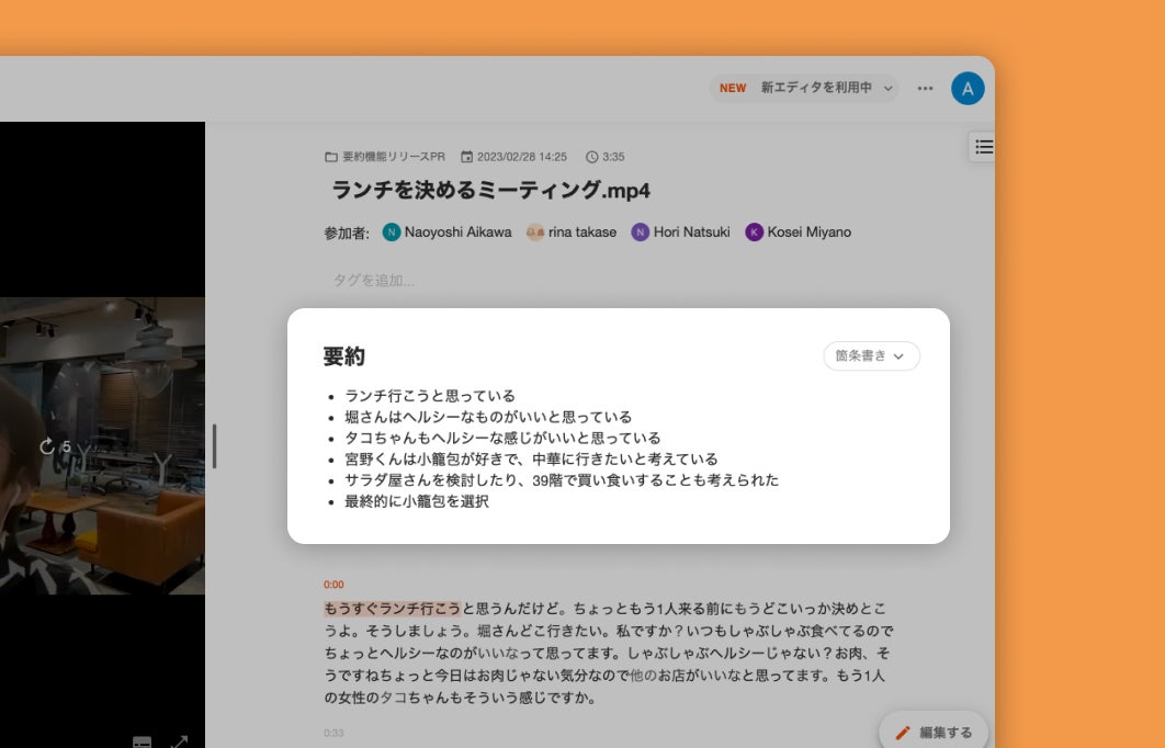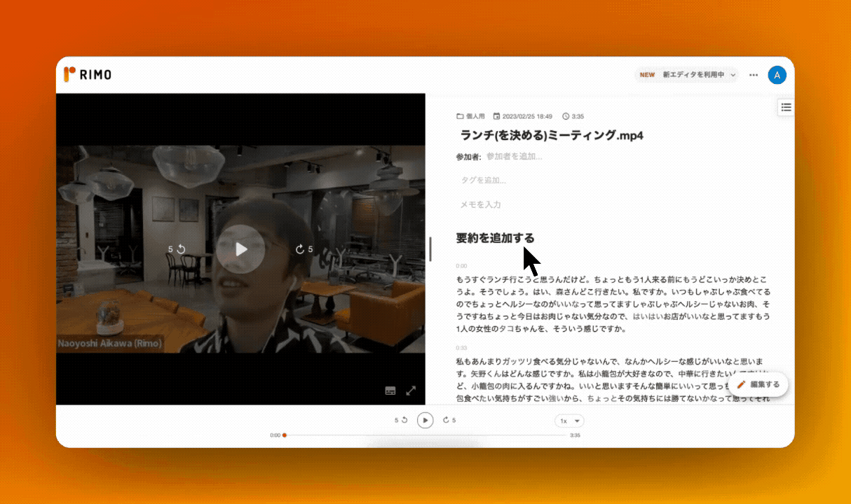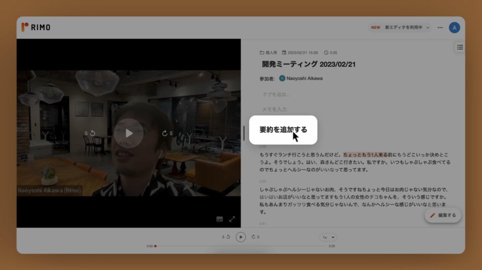 ※要約機能は、OpenAI を利用しているため、文字起こしの内容が OpenAI に送信されます。Rimoでは、利用に際しセキュリティに配慮しており、データを暗号化して送信した上、ChatGPTのデフォルトと異なり、AIの改善に利用しない申請を行った上で OpenAI を利用しています。