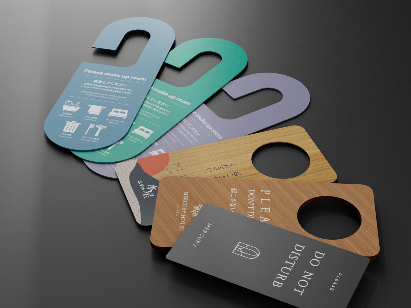 "Do not Disturb"の表示をするためのドアノブにかけるカードです。このアイテムはお客様との重要なコミュニケーションツールとなり、ホテルのサービス品質を反映するものです。ホテルの雰囲気に合わせて様々な素材から選ぶことが可能です。
