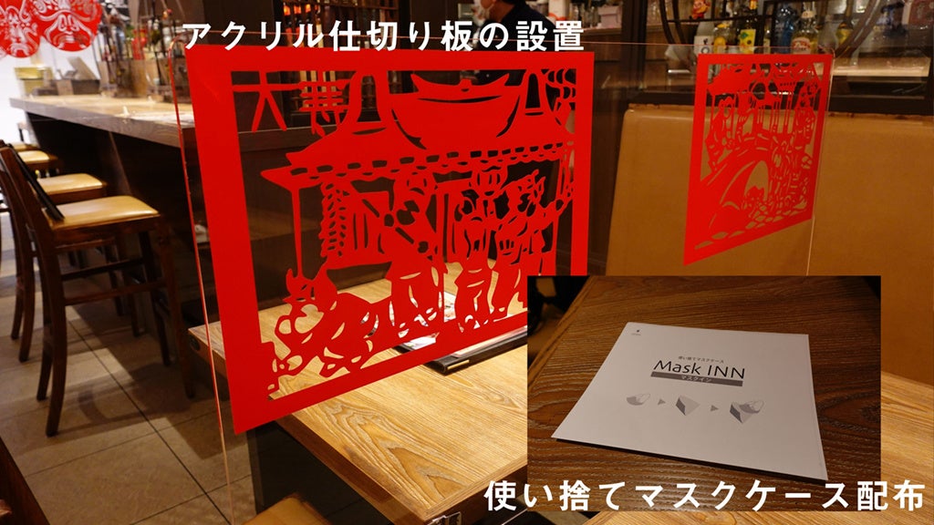 陳麻婆豆腐では感染症の予防対策として、消毒液の設置、ソーシャルディスタンスを保つためのアクリル板の設置、テーブルなどの入念な消毒措置、マスクを清潔に収納してもらうための使い切りマスクケースの配布を行っております。