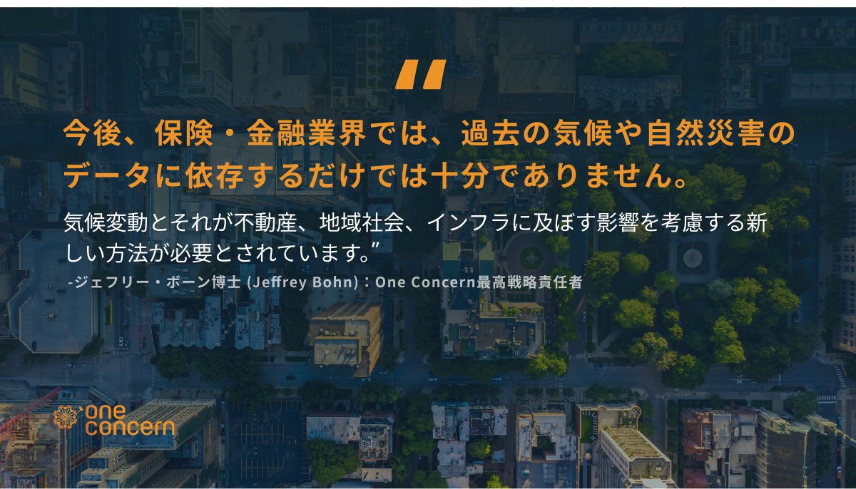 One Concernの最高戦略責任者であるジェフリー・ボーン博士(Jeffrey Bohn)は次のように述べています。「急速な気候変動は、私達がリスク対策を計画するよりも早く新たなリスクを生み出しているという状況に気が付くのに長い時間がかかりました。パンデミック、グローバルなサプライチェーンの問題、深刻な自然災害により、電力、輸送、地域社会などの障害に対する脆弱性が増大していることへの認識が高まっています。しかし、これらの脆弱性を測定する能力がなければ、企業や政府は気候リスクを効果的に評価、軽減、報告することができません。これは、物理的リスクの開示に関する規制要件が差し迫る中、特に重要なことです。」