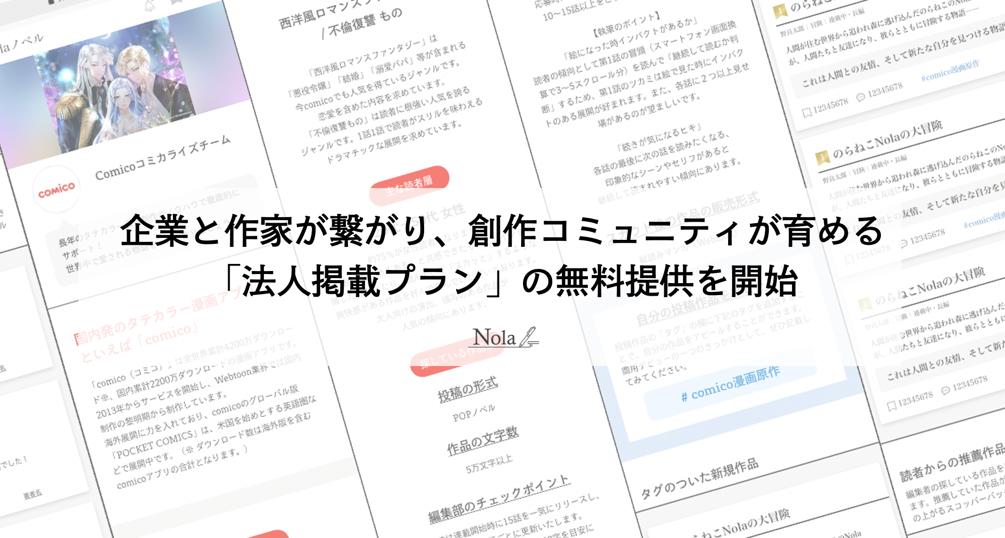 物語の創作をサポートする執筆ツール「Nola(ノラ)」を提供する株式会社indent(本社:神奈川県相模原市、代表取締役社長:釜形勇気、以下「indent」)は、運営する小説投稿サイト「Nolaノベル」にて、各社の編集部の求めるテーマや要素を作家に発信し、常設的に原作募集ができる法人掲載プランの無料提供を開始しました。