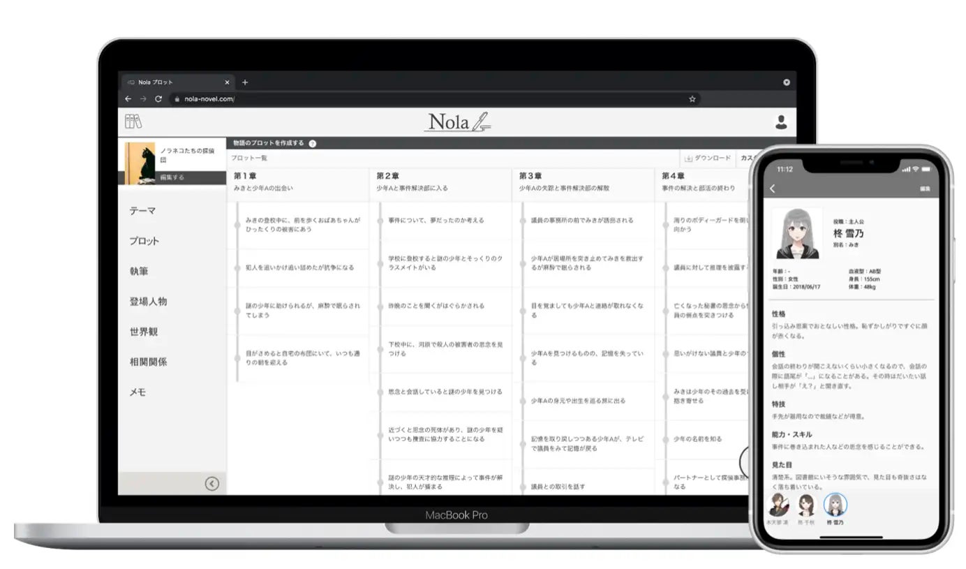 PCとスマホの双方でデータを同期して利用できることに加え、プロットや登場人物の管理などを通して、構造的な物語の創作をサポートできるのが特徴です。