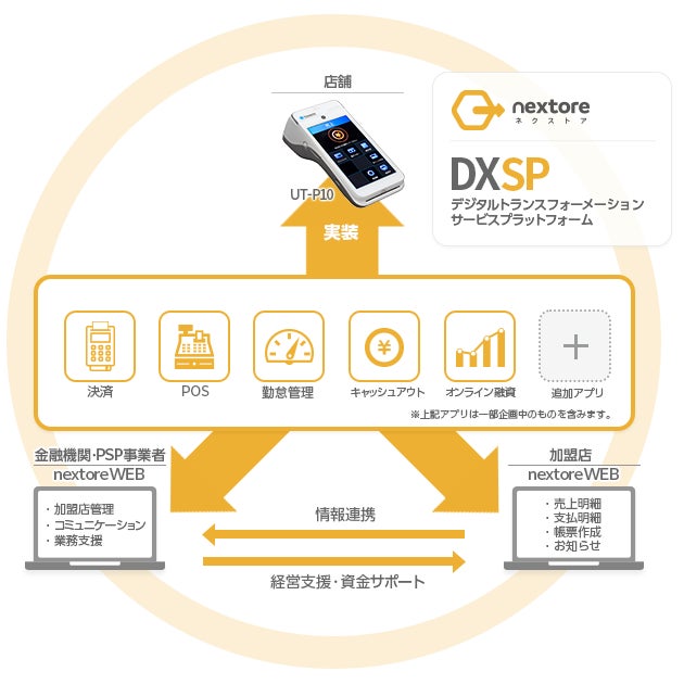 nextoreのサービス利用にあたり、あらゆる決済を1台で実施できるマルチ決済端末「UT-P10」と、加盟店本部および店舗の業務PCがシームレスにつながる管理用WEBサイト「nextore WEB」を提供しています。