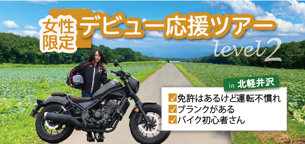 教習所卒業後、初の公道デビュー!久々のバイク(リターンデビュー)!の女性を限定に、バイク旅のプロがそんな方々のデビューをガッチリサポートします。
