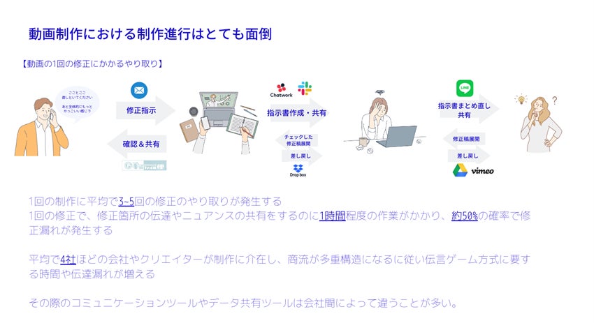 この10年で動画は生活者とのコミュニケーションをとる上で不可欠な存在になっている一方、動画制作の進行管理は10年前からほとんど変わっておりません。それにより、制作進行側の負担が大きいだけでなく、発注側もコストが合わない・修正指示が正確に伝わらない等、動画制作のハードルが高くなってしまっている実情があります。