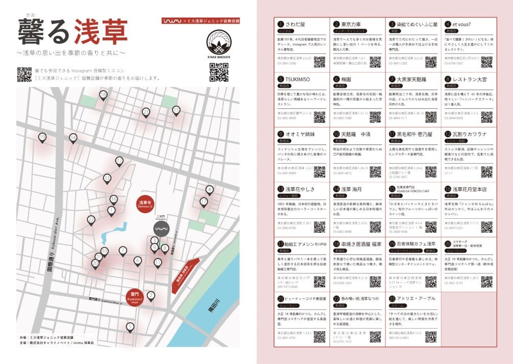浅草で大人気のフレグランス専門店 inimu(イニム)(東京都台東区浅草2丁目1-5 運営:株式会社キャライノベイト)は、誰でも参加できるInstagram投稿型ミスコン「ミス浅草ジェニック」共催イベントとして【馨る浅草】プロジェクトを12月25日より開催中。ミス浅草ジェニック協賛の飲食店や遊園地などにディフューザーを設置し、浅草エリアを四季の香りで馨らせるイベントです。[香りの体験]と[馨る浅草マップ]をきっかけに、ミス浅草ジェニックや協賛店舗に関する認知を広げ、より訪問客を増やすことを目指しています。