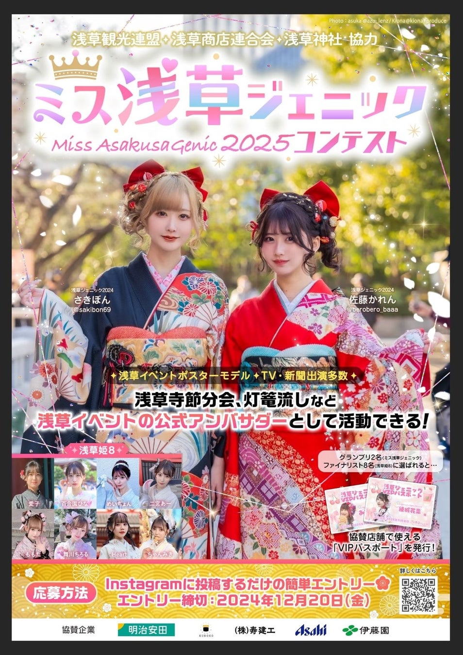 2021年からスタートし、今年で5年目となるミス浅草ジェニックは、浅草の次世代のイメージガールとして活躍するコンテストです。浅草のイベントアンバサダーやテレビ出演、ポスターモデルなどの特典が用意されています。エントリーは、Instagramに浅草で撮影した写真や動画を投稿することで行い、着物でなくてもエントリーが可能です。