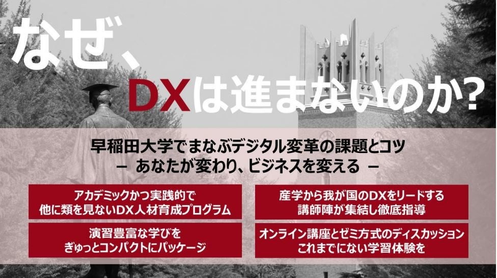 学校法人早稲田大学(所在地:東京都新宿区、理事長:田中愛治)は、文部科学省「DX等成長分野を中心とした就職・転職支援のためのリカレント教育推進事業」への採択(2022年6月17日)を受けて、DXやデジタルビジネスの企画・立案・推進等を担うデジタルビジネスデザイナーといった、DX中核人材を育成することを目的とした、スマートエスイーDXコース(以下、DXコース)を2022年10月8日に開講します。DXコース開講を記念して、DXシンポジウム・交流フォーラムを8月27日(土)に実施します。本フォーラム内ではDXコースの募集説明会も実施します。