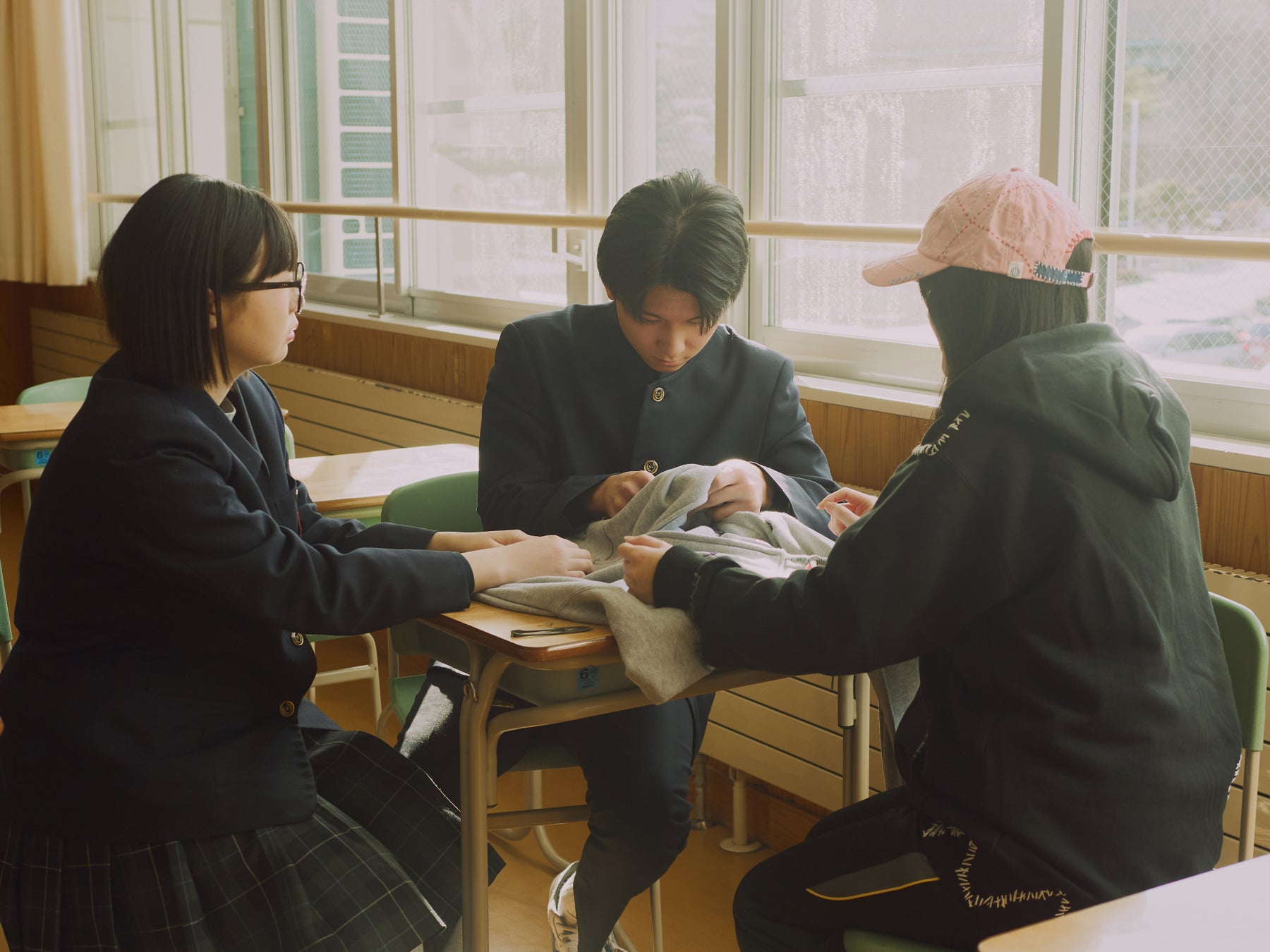 撮影にはサシコギャルズが次世代の担い手育成として、刺し子の授業をしている高校の生徒たちも参加をしています。