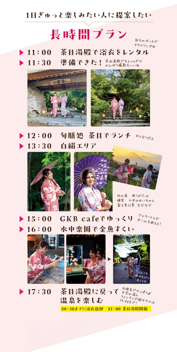 また、「湯かたで写んぽ」を同時開催。温泉と浴衣レンタルがセットになっており、富士山麓の絶景を背景に写真撮影ができる。