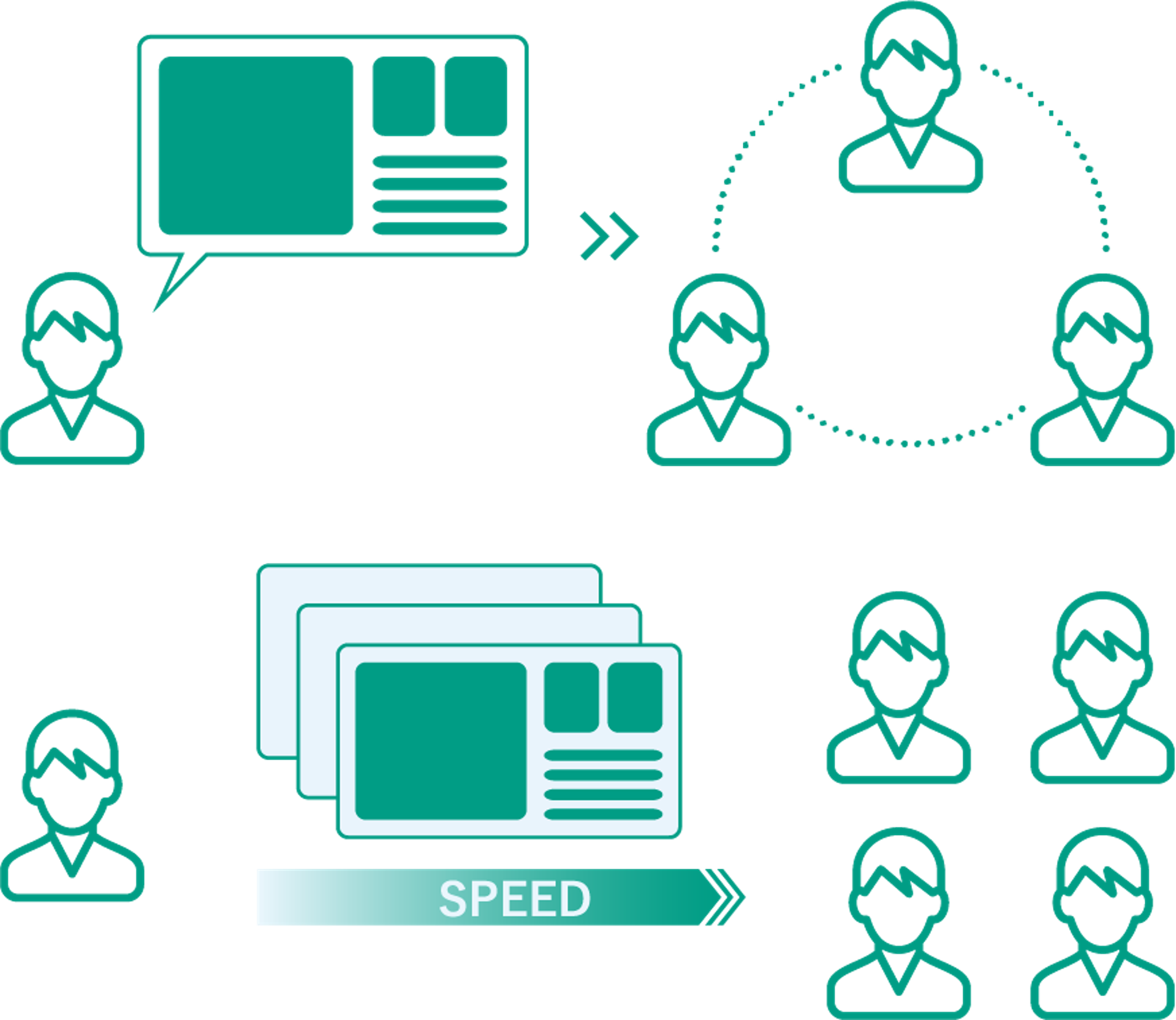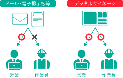 デジタルサイネージは、メールやグループウェアのように自ら端末を操作して情報にアクセスする必要が無いので、その場にいる人全員に対して同じレベルで情報を発信することができます。