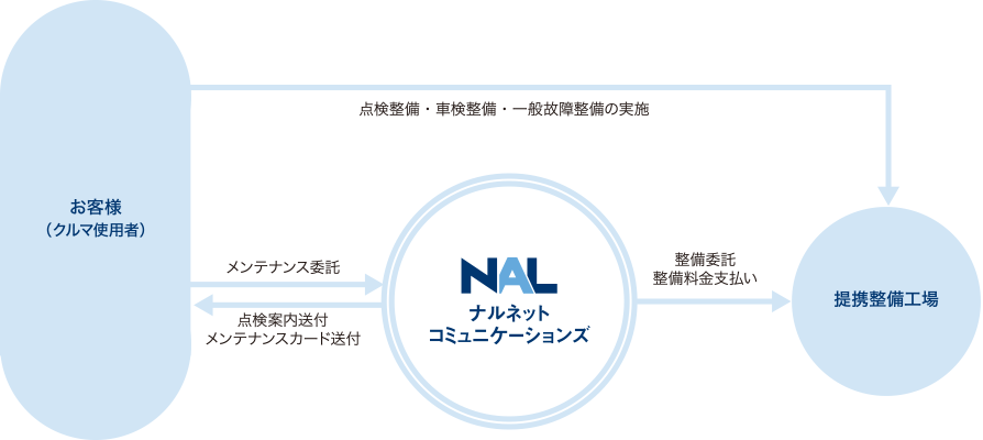 管理車両のメンテナンスを全国約10,000ヵ所の提携工場に委託、本社で車両情報を一元的に管理し、効率的なデータ収集や顧客対応を実施しています。少ない入庫回数で充分なサービスを行うことで車両稼働率を向上させ、自動車ユーザーの利便性を高めるほか、独自の整備データベースに蓄積した整備記録に基づいたメンテナンス料算出を行うことで整備工場の業務効率化を支援します。