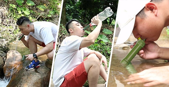 水源に直接浄水器を入れたり、ペットボトルにつけてストローのように吸ったり、様々な方法で使えます。