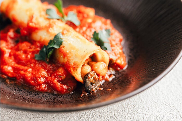 毎月定番の締めのパスタですが、今回はカネロニの中に、マッシュルームとひよこ豆、ブラックオリーブをペーストにしたものを詰めました。
