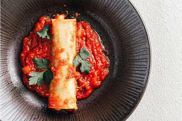 ”カネロニ”とは、イタリア語で「大きな葦」を意味する円筒形のパスタの一種のこと。