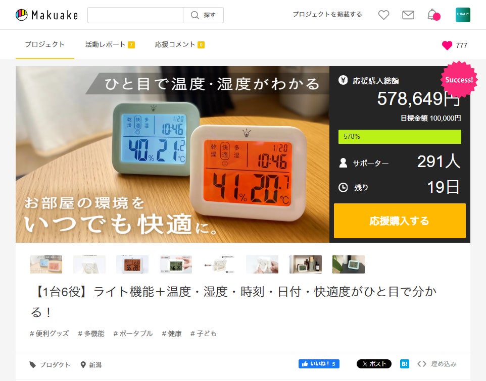 生活雑貨ブランド「ミタス(mitas)」は、クラウドファンディングサイトMakuakeにて2024年3月13日に「デジタル温湿度計」の先行販売を開始し、公開後約1時間で目標金額を達成した。