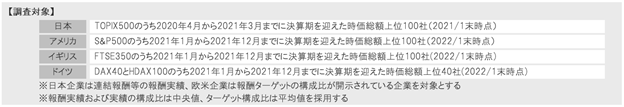 本調査では、2021年における日本、アメリカ、イギリス、ドイツ企業のCEO報酬の報酬実績、報酬構成比(報酬ミックス)、および業績評価指標を比較しています。調査概要は以下の通りです。