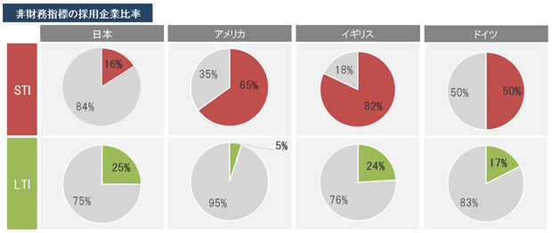- 非財務指標を採用する日本企業の割合は、STIで16%、LTIで25%。海外企業はSTIで非財務指標を採用する傾向がある一方、日本企業はLTIで非財務指標を採用する傾向がある