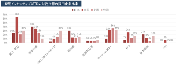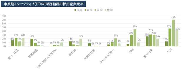 日本企業はSTIにおいて、営業利益や純利益に関する指標を採用する企業が多い一方、欧米企業と比較して、キャッシュフローや1株当たり利益(EPS)に関する指標を採用する企業は少ない傾向がみられました(図表4)。また、日本企業はLTIにおいて、営業利益や資本効率に関する指標を採用する企業が多い一方、欧米企業と比較して、キャッシュフローやEPS、株主総利回り(TSR)に関する指標を採用する企業が圧倒的に少ない傾向がみられました。