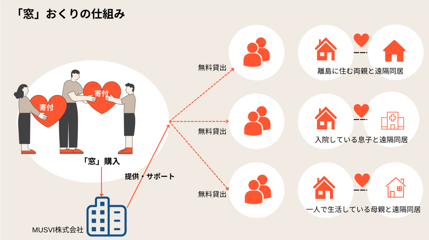 「窓」おくりの仕組みは、寄付等でいただいた「お金」を「窓」の購入並びに利用料にあて、第1期では3セットの「窓」を購入します。1クールを6ヶ月とし、半年間3組の方に「窓」を無料貸出し、離れていても一緒に生活をする遠隔同居を 【「窓」おくり】 として体験していただけます。