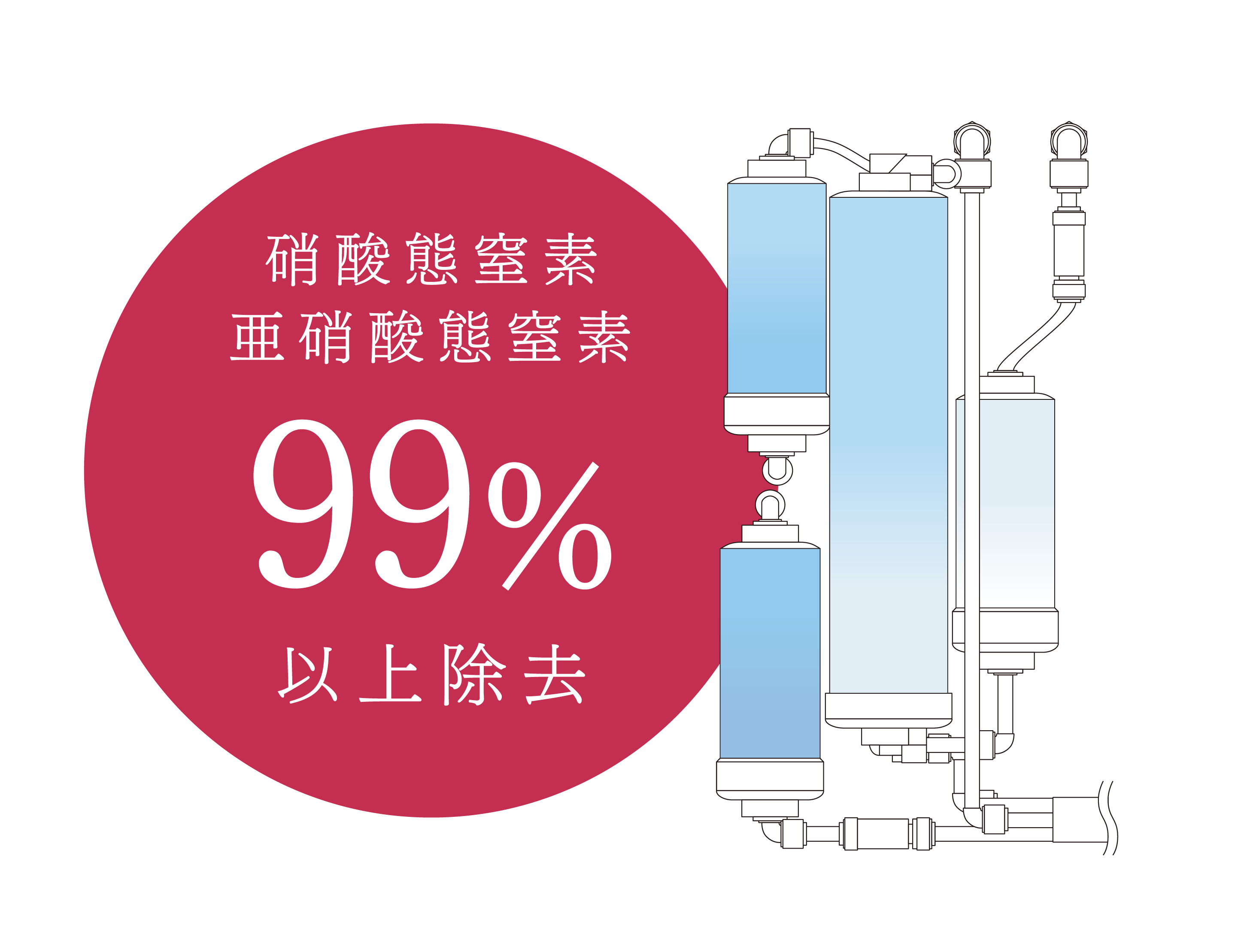 弊社製品は独自開発の4つの浄水フィルターを用いることで、発がん性を有する可能性のある硝酸態窒素・亜硝酸態窒素を99%以上除去し、厚生労働省が定める水質基準(10㎎/L以下)を大幅に下回る (0.1mg/L以下)水を作り出します。
