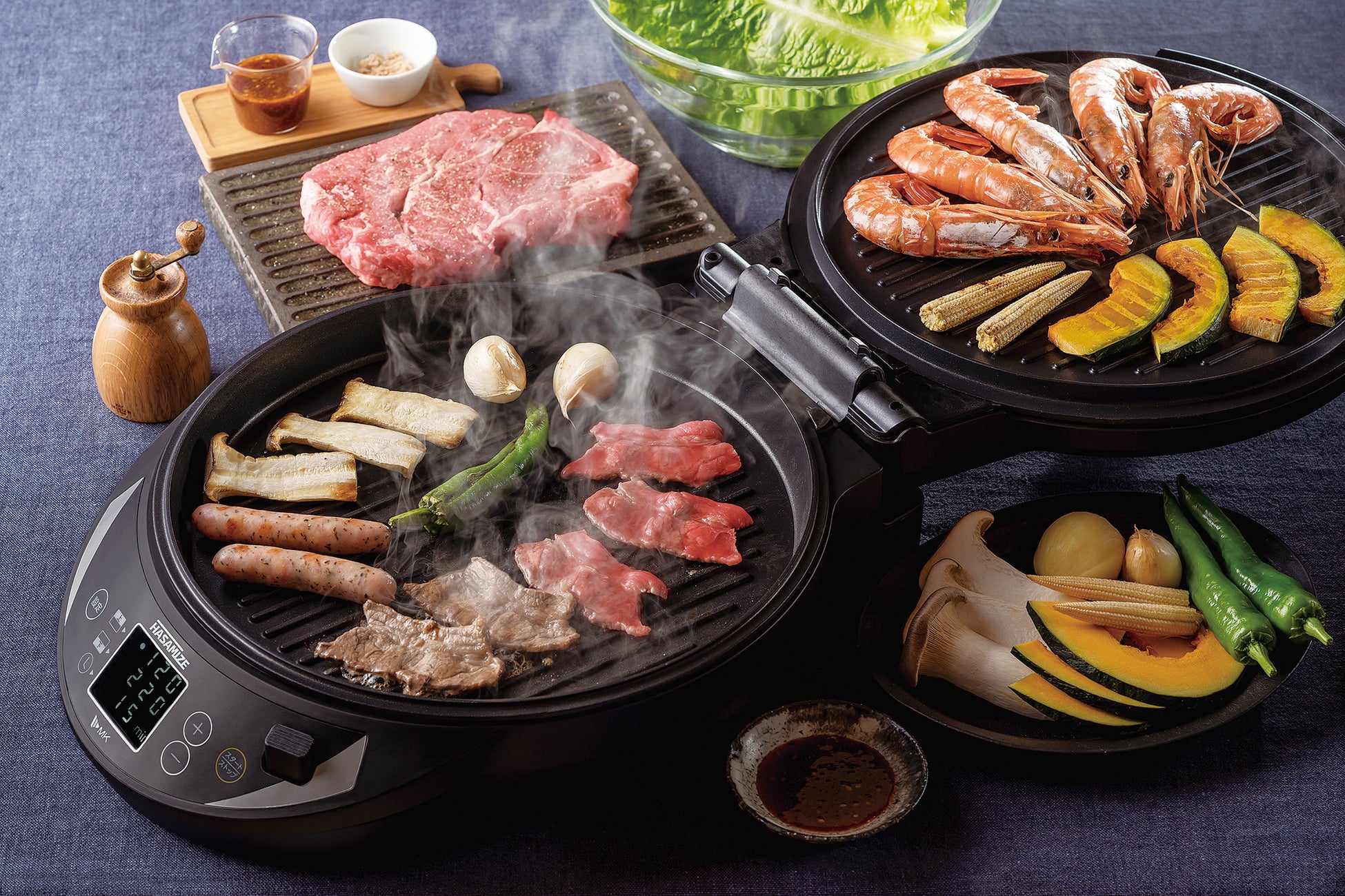 180度開いて一般的なホットプレートとしても使用可能。プレートが2枚に分かれているため、味が混ざらず、2品同時に調理することができます。開いた場合も、プレートごとに温度調節ができるため、異なる食材も焦がさずおいしく焼きあがります。
