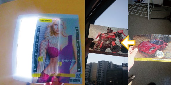 入射光を再帰反射して異なるデザインが見える手品印刷技術です。 スマートフォン・デジタルカメラでフラッシュ撮影をするとその光に反射し、隠された絵柄・文字を発光させてカメラに記録させることができます。
