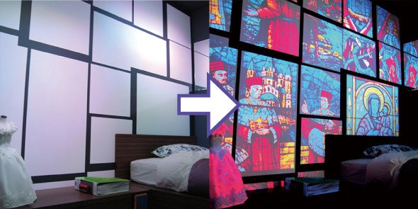 印刷背面に光を照射すると異なるデザインに切り替わる手品印刷技術です。 電飾コルトンBOX や室内照明・太陽光など、どんな光でも背面からかざす事で、隠された絵柄・文字へ切替えが可能です。LEDで点灯プログラムと組み合わせるとアニメーション的演出も可能です。