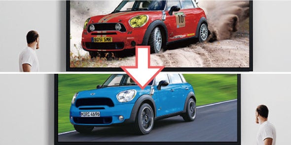 見る角度(左右・上下)を変えることで全く異なるデザインへ切り替わる手品印刷技術です。 レンチキュラーレンズを使わず、積層印刷により完結することから大判生産が容易で設置施工性にも優れた製品となります。ある一定の角度から見ることによって、2種類の絵柄が入れ替わります。