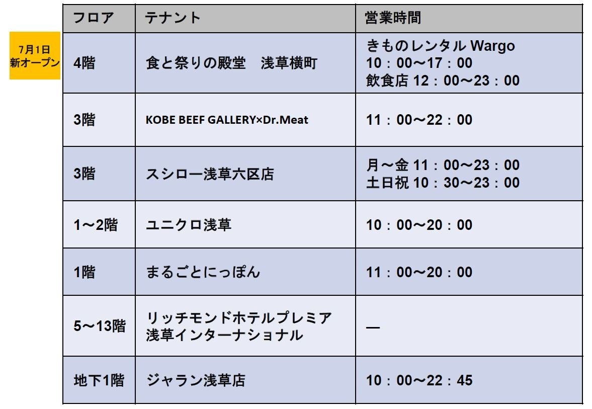 | 【オープンを記念した特別イベントを開催】 ・7月1日(金)16時50分より「祭りon MATSURI」 浅草サンバカーニバルで4連覇中の「仲見世バルバロス」によるサンバ、足長クラウン(大道芸人)や、よさこいが浅草を練り歩きます。 ・7月1日(金)16時00分より「浅草神社による開運祈祷」 関係者一同によるテープカット。店内ではよさこいソーランサークル「GARAN43/35°(ガラン)」による、よさこいが練り歩きます。 |