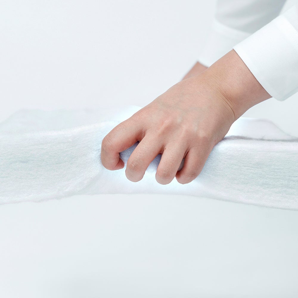 我が社の看板商品であるホワイトキューオン。吸音材と言えば「ホワイトキューオン」とお声をいただくこちらのロングセラー商品は、ペットボトルをリサイクルしてつくった再生ポリエステル素材です。吸音効果と断熱効果を発揮し、さらに湿気に強く、肌に触れても安心な商品です。