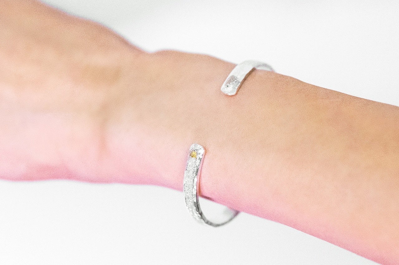 純銀ジュエリーに、4億5千万年前に落下したギベオン隕石と、純金が打ち込まれています。