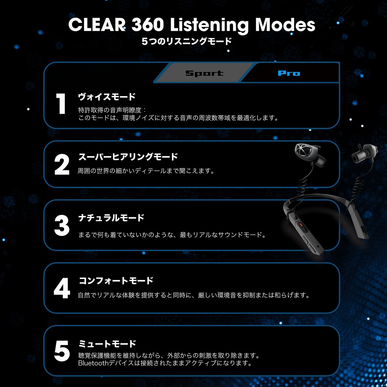 CLEAR360PROは、Bluetooth5.0や5つのリスニングモードなど、保護オプションの選択をサポートする技術を備えています。状況に合わせてモードを変更し使用することにより、あらゆる条件下で快適に使用することが可能になります。産業用に特化するためワイヤード仕様により、電波干渉の影響を受けにくく、音声の途切れや遅延が少なく、騒音が激しい環境でも安定した音質を提供します。