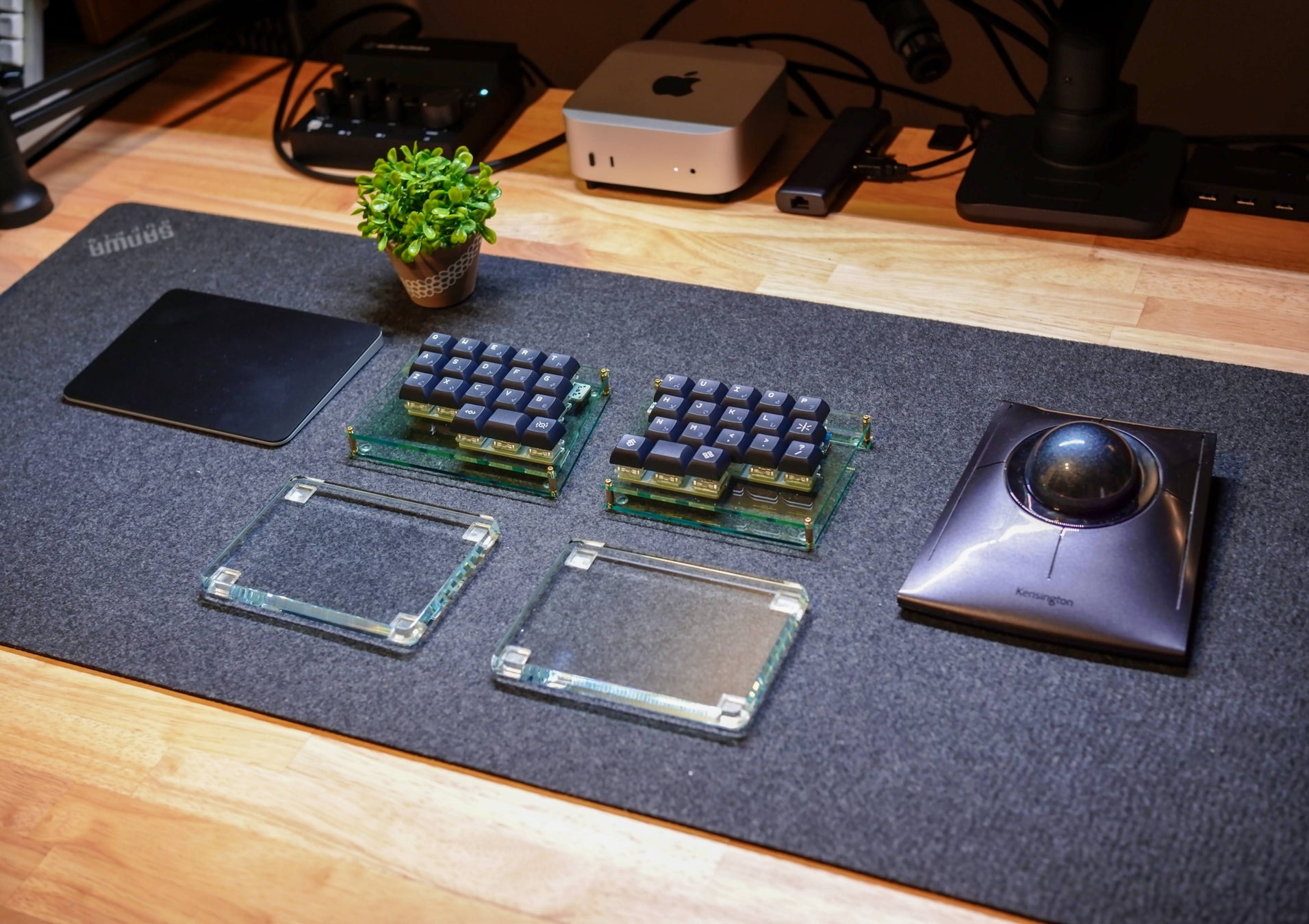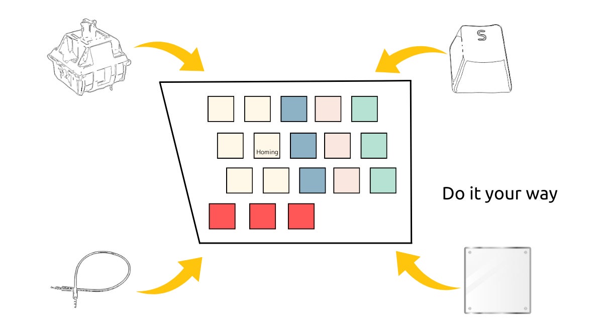 自身の好みに合わせてキーレイアウトを変更できるため、スモールキーボードとしてだけでなく、マクロパッドとしても利用可能です。MCUが2つ付属しているため、一方にはMacのキーレイアウト、もう一方にはWindowsのキーレイアウトを入れてOSによって使い分ける、もしくは一方をショートカットキーを登録したマクロパッドとしても利用可能です。さらには、キースイッチだけでなく、キーキャップ、アクリルプレート、TRRSケーブルに至るまで、自分自身でカスタマイズできます。※アクリルプレートはオプションとして提供しています。