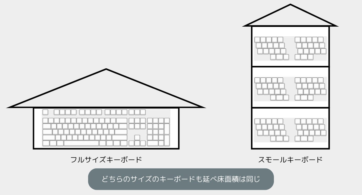 キーボードを家に例えるならば、キー数の多いフルサイズキーボードは「平屋建て」、キー数が少ないキーボードは「2階建て」のようなイメージがしっくりくるでしょう。