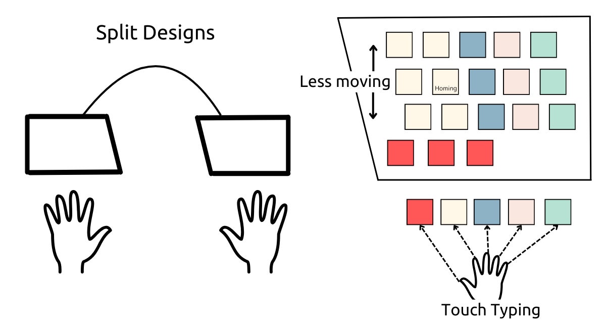 左右分割デザインにより、自然な姿勢で手を広げてタイピングすることができます。また、キー数が少ないため、指の移動を最小限に抑え、効率的にタイピングできるでしょう。