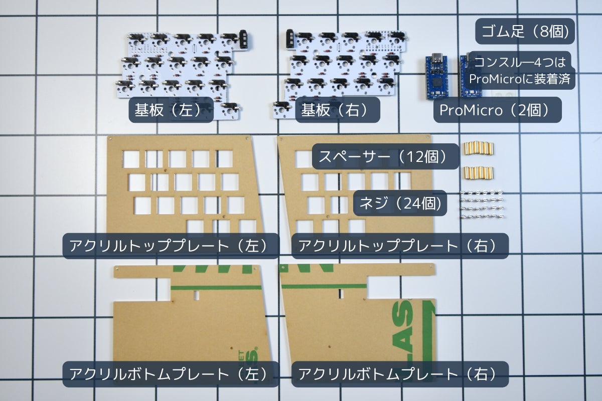 Gravity36は「自作キーボードキット」となっており、キースイッチ以外のパーツはすべてキット内に同梱されています。