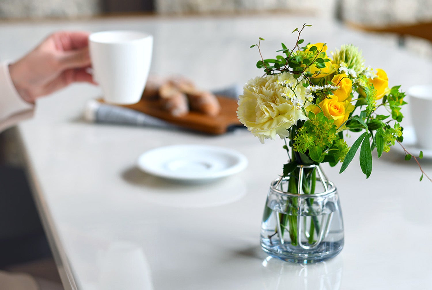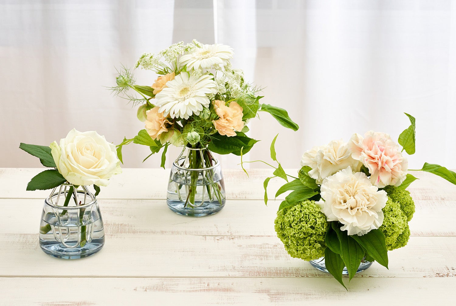 抗菌ホルダーは一輪挿しからミニブーケまで対応。サイドからも挿せるので切り戻しで短くなったお花を最後まで楽しめる仕様。