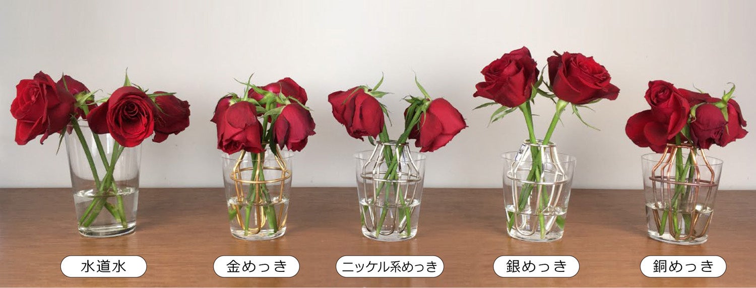 お花が日持ちしない原因のひとつは水揚げの悪化。水中の細菌(バクテリア)が増殖すると茎の道管が詰まり、お花が水を吸えなくなります。本品は銀めっきの抗菌効果で細菌の増殖を抑え、水をキレイに保つサポートをします。
