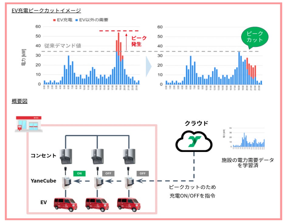 株式会社Yanekara(千葉県柏市、代表取締役 松藤 圭亮/以下「Yanekara」)は、日本郵便株式会社(東京都千代田区、代表取締役社長 衣川 和秀/以下「日本郵便」)と郵便局の集配用EV車両の充電を遠隔で監視・コントロールすることにより、郵便局全体における電力ピークを抑制する実証実験を2022年7月25日(月)から同年9月30日(金)に実施し、ピークカット効果を確認しました。