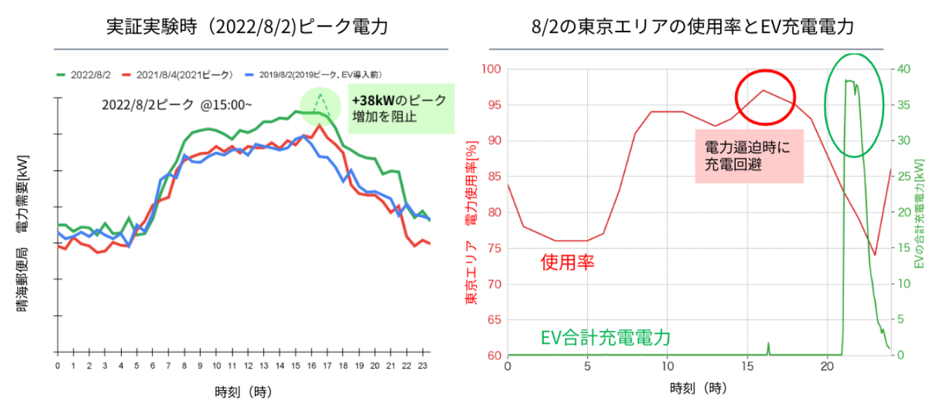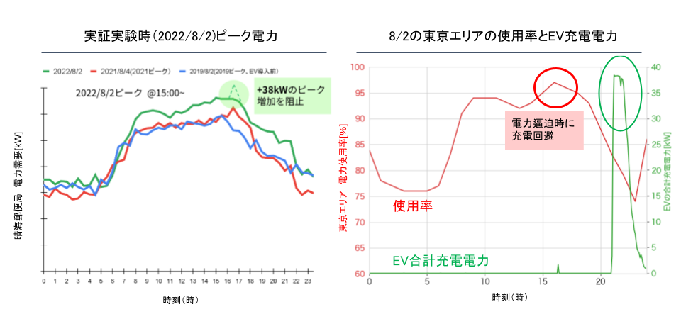 晴海郵便局における電力使用量のピークについて、2021年度の電力使用量パターンと比較し推計で38kWの抑制を確認しました。本抑制による同局の年間での電気代削減見通しは約45万円程度となります。また、充電制御により電力使用率が高い夕方の時間帯を避け、東京エリアの電力使用率の低い時間帯での充電を実施することを確認しました。